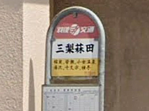「菻」という字が使われた唯一のバス停と思われます。一般にはリンと読み、きつねあざみという草を表すとのこと。「一房に三つの梨がなる大きな梨の木があるので三梨という地名に、菻田は田の一面にガツギが生えていたので名がついた」(秋田大)。がつぎとは方言でマコモ(真菰)のことをいうそうで、このあたりでは「菻」をあてているようです。三梨町菻田が公的住所となっています。 GoogleStreetView |