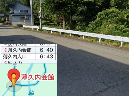 横手市の「上薄井」バス停とペアになりそうなバス停です。残念ながらバス停標がありません。位置はGoogleMapsで検索された場所です。「秋ノ宮薄久内」(あきのみやうすくない)が公的住所になっています。近くを流れるのは薄久内川です。他に薄久内入口バス停もありますがこちらもバス停標がありませんでした。 GoogleStreetView |