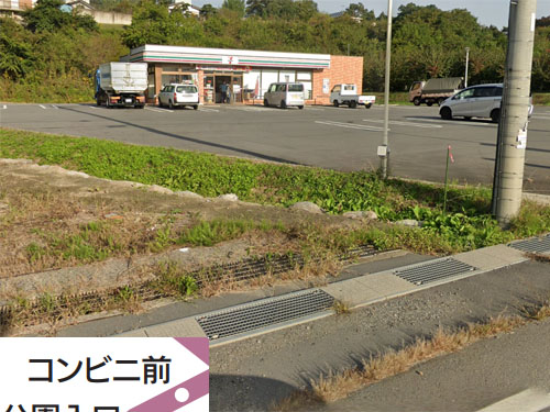 全国どこでも通用しそうなバス停です。バス停ポールが見当たらないのが残念。「コンビニ前」だけのバス停はここだけのようです(他は「○○コンビニ前」)。ストビュの位置は、国土交通省データに拠りました。 GoogleStreetView |