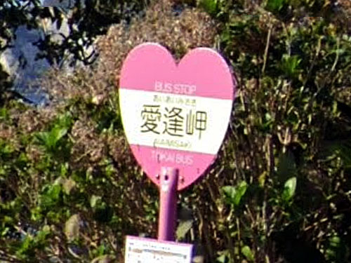 有名な観光地です。バス停の丸板がピンク色のハート型です(東海バスで3つ)。なお、このバス停から恋人岬までは、アップダウンの激しい遊歩道を15分ほど歩く必要がありますので(自家用車駐車場からも遠い)、カップルで行った際は「遠いー」「ダルいー」などど文句を言ってけんかなどしないようにご注意ください(笑)。 GoogleStreetView |