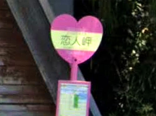有名な観光地です。バス停の丸板がピンク色のハート型です(笑)。なお、このバス停から恋人岬までは、アップダウンの激しい遊歩道を15分ほど歩く必要がありますので(自家用車駐車場からも遠い)、カップルで行った際は「遠いー」「ダルいー」などど文句を言ってけんかなどしないようにご注意ください(笑)。 GoogleStreetView |