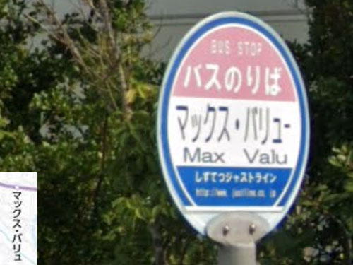 「マックスバリュ」だけのバス停はいくつかあるのですが、多くは駐車場の中に入っていて、GoogleStreetViewが近づけていません。ここは公道なのですが、バス停標には、マックスバリュの公式表記に、「・」とのばす音が入っています。路線図上は「マックス・バリュ」になっています。 GoogleStreetView |