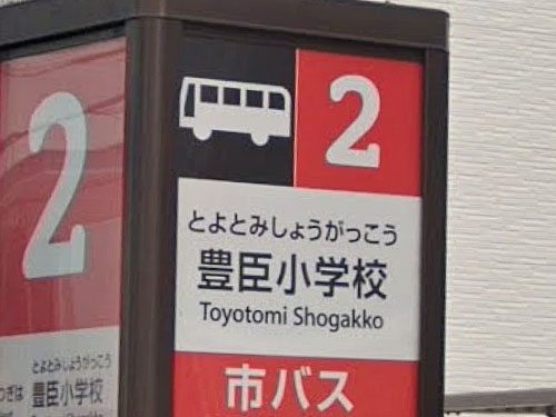今のところ全国で「豊臣」がつくバス停はここしか把握できていません。「徳川」がつくバス停は少なくとも8つあることを考えると、やはりバス停名も負けた一族には少し冷たいのかもしれません。「校名は学区が豊臣秀吉ゆかりの地であることから名付けられた。2011年度の全児童数は137人。小規模校解消のために諏訪小学校との統合が検討されている」(Wikipedia)とのことです。 GoogleStreetView |