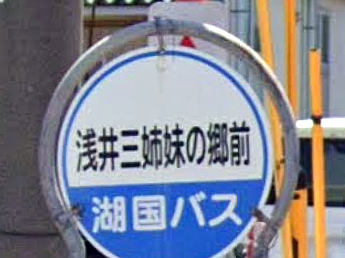 道の駅浅井三姉妹の郷の前のバス停です。「姉妹」がつくバス停はここだけのようです。浅井三姉妹は、戦国武将浅井長政と正室市(織田信長の妹)の間に生まれた茶々、初、江のことです(長政は信長と対立、長政は切腹、市は再婚した柴田勝家とともに自害、三姉妹は豊臣秀吉もしくは織田信雄に保護されたとされます。茶々はいずれ豊臣秀吉の側室に)。2026年のNHK大河ドラマは「豊臣兄弟!」ですが、その放送に合わせてこの道の駅には「近江豊臣博覧会」の会場の1つが置かれるそうです。 GoogleStreetView |