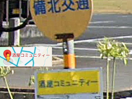まるでお酒やさんを舞台に展開するコミュニティーのように思えてちょっとほほえましい感じですが、西酒屋町の「酒屋コミュニティセンター」前なのでした。バス停の名前には伸ばし棒「ー」が入っています。 GoogleStreetView |