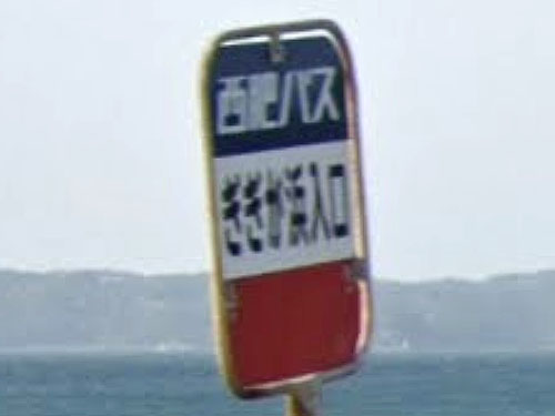 砂がギシギシいっている感じがする名前と思ったら、由来もそれに近いものでした。「(1069年)松浦党の党祖・源久公がこの浜に上陸したときに、輿「こし」のきしむ音が砂に伝わって「ギイギイ」と鳴ったことからこの名がつきました」(松浦市の観光サイト)。なお、GoogleMapsではバス停は「閉業」と出ます。これは2025年3月の、西肥自動車伊万里-西分-松浦線の廃止とともにバス停も廃止されたこと(Wikipedia 西肥自動車)を表しているようですが、2025年4月現在松浦市のりあいバスのぎぎが浜バス停があります。ストリートビューが2024年撮影のため、西肥自動車のバス停標が写っています。 GoogleStreetView |