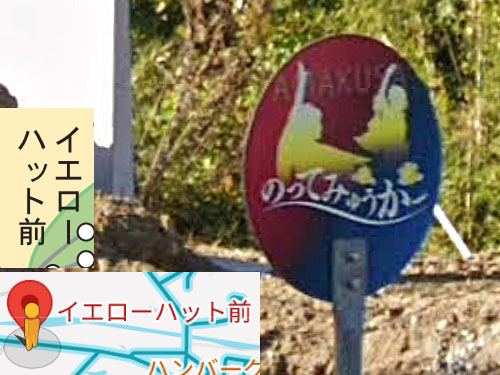日本で唯一と思われる「イエローハット」が付く名前のバス停です。丸板に名前が入っていなくて残念です。なお「オートバックス」がつくバス停はないようです。更に、「「のってみゅうかー」は、熊本県上天草市(旧大矢野町)で運行されていた循環バスの愛称です。方言の「乗ってみませんか」という意味に由来」(GoogleSearchAI)だそうです。 GoogleStreetView |