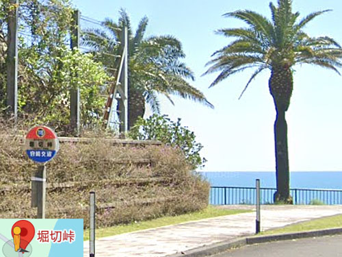 難読ではありません。海の見える峠のバス停です。南国らしくヤシの木も見事です。少し早咲きのヤマザクラの名所でもあります。 GoogleStreetView |
