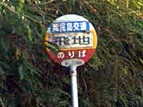 「飛地」バス停は日本で唯一のようです。このバス停ポールの向かい側には、実際に志布志市の飛地があります。 GoogleStreetView |