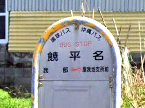 饒平名が公的住所になっています。難読地名、難読バス停名ですね。「饒」というかなり難しい字が使われています。饒は「ジョウ・ニョウ、ゆた(か)・ゆた(かにする)・おお(い)」と読み、「十分にある。ゆとり。あまる。物が十分である。」という意味とのこと。古くは「饒平名村」をゆぴなむらと読んだそうで、更に想像がつかない読み方です。一方、バス停では簡略化された異体字を使っています。村名の意味は「広い原という説がある」(沖縄地名考、Nagopedia)。 GoogleStreetView |
