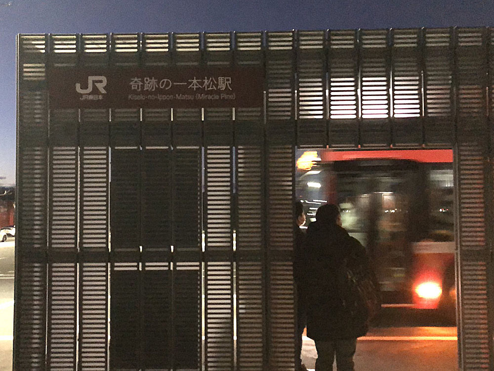 JR東日本の大船渡線BRT(BusRappidTransit)の「駅」であり、実際に走っているのはバスです。JRでは駅の扱いになっています。丸いバス停標識はここにはありませんでした。「奇跡」とつく名前はすごいと思いますし、数万本あった松が、奇跡の松としてここにたった一本だけ残ったことを思うと、とても心がゆさぶられる名前だと思います。 |