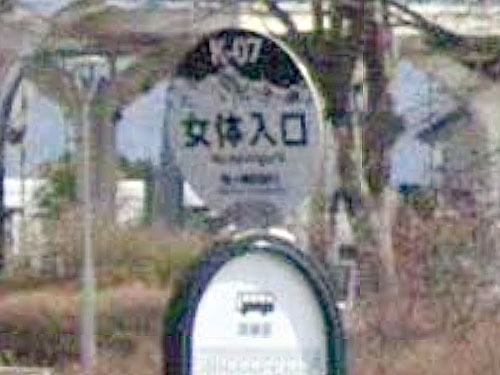 以前から良く知られていると思われる珍名バス停です。近くに「女体」集落あり。「由来は諸説あり、山並みが横たわる女性に似ていた、女人禁制のお寺があり、女性は待っていた→女待が転じたなどなど」(ジョルダン)。 GoogleStreetView |