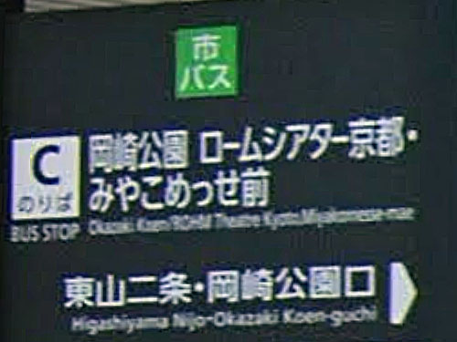 京都市バスでは最長クラスのバス停名です。英語表記も長くて大変そうです。(Okazaki Koen ROHM Theatre Kyoto Miyakomesse-mae) |