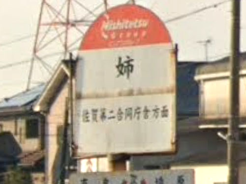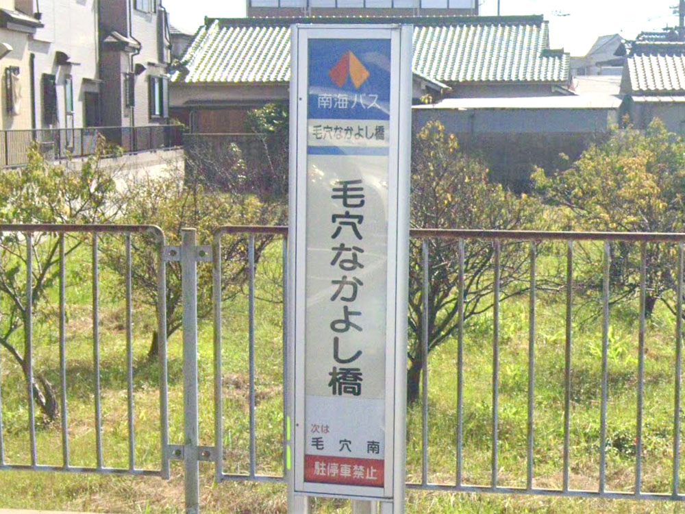 南海バス公式ツイッター(X)によれば、南海バス唯一の珍名バス停だそうです。地名の毛穴は14世紀の、当地の氏族の名だったと書いています。バスはなかよし橋を渡るとのこと。次のバス停は毛穴南。 GoogleStreetView |