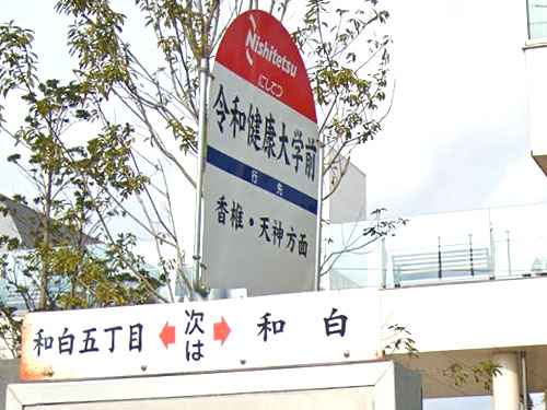 「令和」とつく数少ないバス停です。バス停は令和健康科学大学前にあり、大学は2022年(令和4年)に開学したそうです。バス停の毛筆風のフォントが素敵です。 GoogleStreetView |