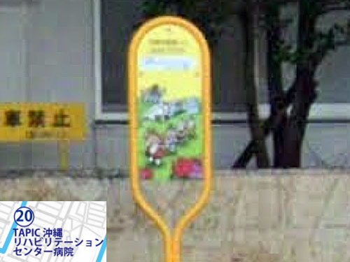 沖縄県では長い方のバス停名です。バス停標の名前が見えないのが残念です…。 |