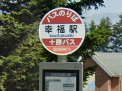1987年に廃止された旧国鉄広尾線幸福駅は、ちょっとした観光スポットになっています。駅舎(レプリカ)、ホーム、保存車両(キハ22気動車、除雪車)が残っています。すでに駅ではないのに、バス停名には「駅」とついています。名称に「旧」や「跡」はついていません。 「札内川のアイヌ語名「サッナイ」に「幸震(さつない)」と当て字し、後年音読みの「幸震(こうしん)」を村名としていたが、福井県人の入植が多かった土地であること、また「将来の幸福を願う意味もあって」、「幸福」の地名が生まれたとされている。」(Wikipedia) GoogleStreetView |