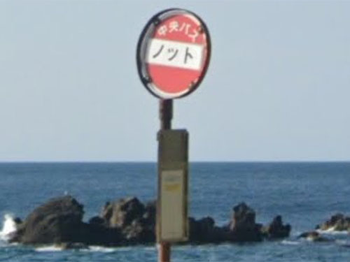 バス停ポールがなかなかよい海を背景に立っています。「北海道古宇郡神恵内村珊内村ノット」というのが住所だそうです。崖がせり出しており、アイヌ語の「あご」が由来ではないかとの説があります。 GoogleStreetView |