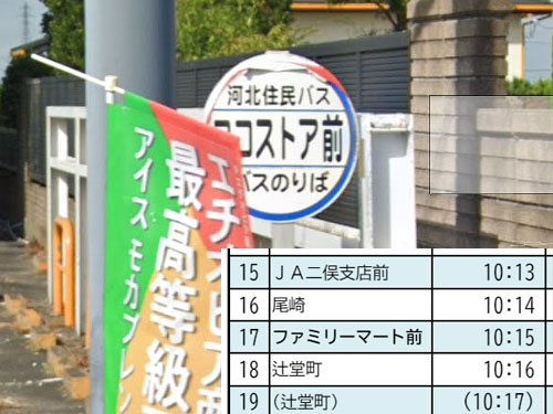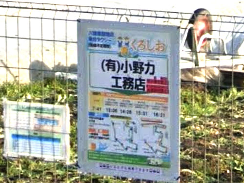 全国に「工務店」がつくバス停は7つほどありますが、フルネームと思われる工務店の名前はここだけです。走っている「くろしお」号は小学校の登下校を主な目的としているようで、下校時のダイヤは学校の終業時刻に合わせて4パターンのうち1つで運行されるとのことです。 GoogleStreetView |