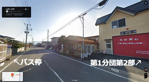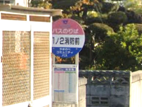 「1ノ2」とは、一見すると小学校のクラスのようです。消防の第1分団第2部の近くにありました。他に2ノ1消防前、5ノ3消防前、6ノ3消防前バス停もあります。 GoogleStreetView |