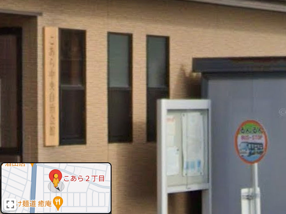 ひらがな書きで、とてもかわいい地名です。バス停名が歩道側を向いていてストビュでは見えません。いつか自分で行って写真を撮りたいです。後ろには「こあら中央自治会館」があります。昔は「古荒」という地名だったそうですが(古荒とは「廃田」のことで、これを復旧したことに由来する)、いかつい印象なので、地名変更したとのこと。荒々しい地名が一転して可愛くなりました(笑)。 GoogleStreetView |