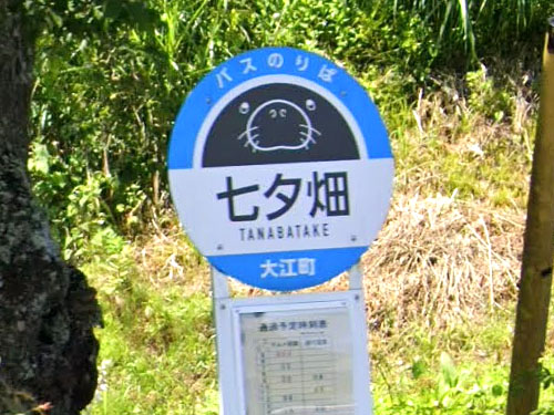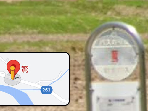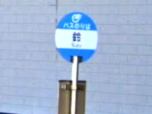 全国に、ずばり「鈴」という一文字バス停はいくつかありますが、こちらはGoogleストリートビューの文字の判読性が良かったので(笑)。鈴は現在の地名ではなく、由来ははっきりとは分かりませんでしたが、10Kmほど離れた八乙女浦では、飛鳥時代に蜂子皇子が、八人の乙女の歌声と美しい鈴の音を聞いたという伝説があるそうです。 GoogleStreetView |