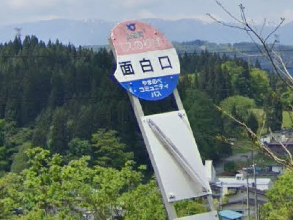 ここから4Kmほど山奥に面白集落があります。面白は、上記の大江氏が戦に破れ、隠れ住んだ場所とのこと。面白の地名は、その際に上記の顔好の顔を面に置き換えたことによるそうです。雪のせいかバス停標識が傾いてしまっています。 GoogleStreetView |