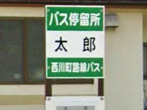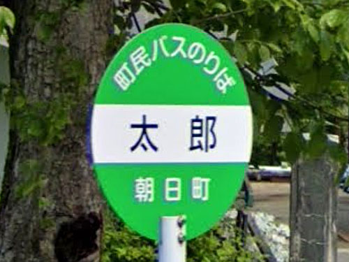 同じ太郎バス停です。こちらは大字太郎という住所になっています。小字でしょうか、「太郎二」や「太郎三」という場所もあるようで、そこを示すときは「朝日町大字太郎太郎三」のように太郎が2回繰り返されるようです。調べましたが由来は分かりませんでした…。 GoogleStreetView |
