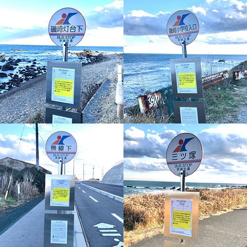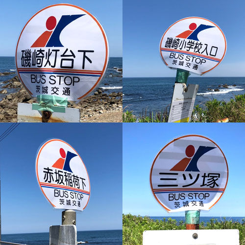 珍名ではありません。海沿いにあるバス停4つの丸板が外れてしまいました(この写真を撮った時、磯崎小学校入口バス停の丸板はかろうじてつながっていたのですが、その後の嵐でちぎれてしまいました)。一方で、この路線は阿字ケ浦駅ー平磯中学校下間にあり、同区間は1日(ただし学休日運休)に片道1本だけ(0.5往復)しか運行されていない、おそらく免許維持路線なので、これらのバス停標の修理をするのかどうかを見守りたいところです…。 (2024年6月追記)金属ではなく、印刷物とパウチを使った形で丸板が再現されました。 (2024年12月追記)しかし、パウチ製丸板は海風には太刀打ちできず、ひと夏もたずにパウチ部分が行方不明となりました。 その後、(赤坂稲荷下バス停を含めて)すべて新品のバス停に代わりました(免許維持路線ですけど)。しばらく海風の心配はしなくてよいようです。 GoogleStreetView(最新)202306、磯崎灯台下 GoogleStreetView(最新)202306、磯崎小学校入口 GoogleStreetView202203、無線下 GoogleStreetView202202、赤坂稲荷下 GoogleStreetView201907、三ツ塚 なお、「今は廃止されたが、茨大前から途中、大洗、那珂湊、平磯、阿字ヶ浦、東海を経て日立港に至る長距離路線があり、二時間四十分くらいかけて走った」(常陽藝文 2000/06)とあります。かなりの長大路線ですね。おそらくここを通ったことでしょう。 |