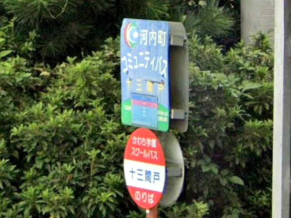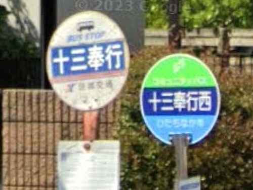 こちらも珍しいバス停名だと思います。住所になっています。由来ははっきりとは分かりませんでしたが、「どこかの長さが13間」の建物があったか、13個のかまど(つまり家)があったのではないか、との説があります。 GoogleStreetView |