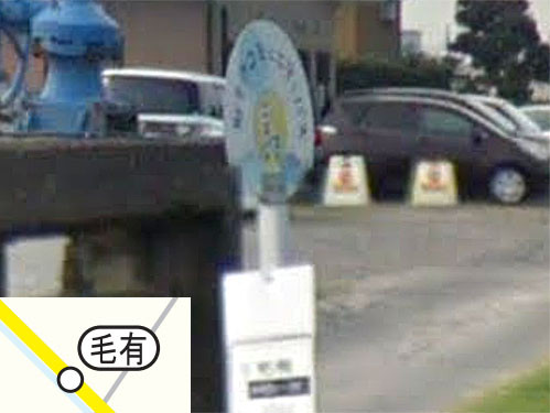 縁起のいい名前のバス停ですが、ストリートビューではうまくバス停名が写っていなくて残念です。「江戸時代前期に開拓され、それまで作物の生えない「毛無新田」と名付けられたが縁起が悪いと「毛有(けあり)」に」だそうです。 GoogleStreetView |
