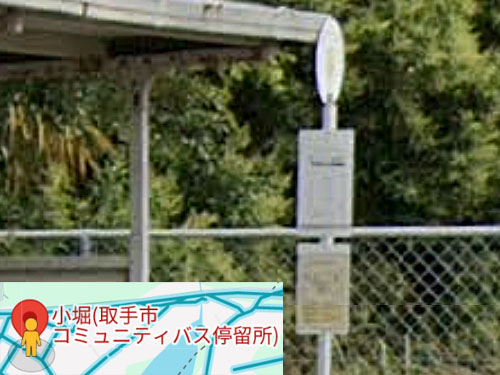 「小堀」と書いて「おおほり」と読む、少し難読な地名です。「洪水の傷痕で、あちこちに水たまりができた。 これを『押堀(おっぽり)』と言い、それが転じて『おおほり』になった」(東京新聞)。(小さな堀をおっぽりと呼んだようです。) 利根川の付替えで、利根川の南側に取り残された、取手市の飛び地のような場所になっているのも特徴です。観光客も乗れる渡し船(有料)もあるとのこと。バス停標のある折り返し場所まではGoogleStreetViewが入れていません。 GoogleStreetView |