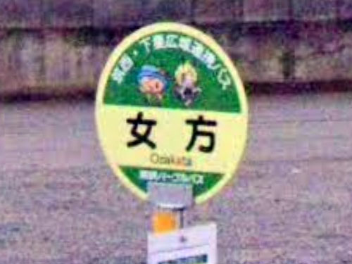 難読バス停です。女方が公的住所になっています。確かな由来は分かりませんでした…。 GoogleStreetView |