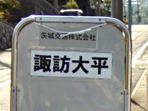 姓名のように見えるバス停です。「すわ・たいへい」さん。GoogleMapsでは「閉業」と出るのと、Navitimeで検索ができないので、廃止されたのかも知れません…。 GoogleStreetView |