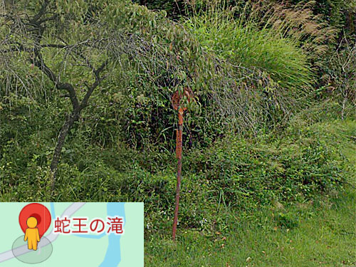 蛇王の滝とはなかなか神秘的でちょっと恐ろしそうな名前ですね。バス停の足元は雑草だし、丸板は木に覆われそうです。こりゃすごい。流れる姿がヘビのようであることから、滝の名が付けられたそうです。近くに蛇王神社もあります。 GoogleStreetView |