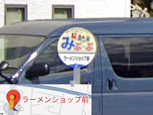 「ラーメン」という単語が入っているバス停はとてもめずらしいです。斜め後ろに「ラーメンショップ」さんがあります。 GoogleStreetView |
