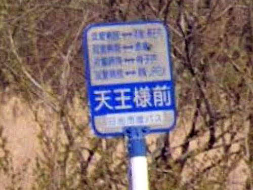 天王様は一般的に、牛頭天王を指すそうです。日本では、疫病を鎮める神として信仰されているとのこと。GoogleMapsには所在が明示されていませんが、バス停の近くに、小さな鳥居と社があるので、これが天王様でしょうか。ストリートビューの桜がきれいです。他県にも「天王様」がつくバス停が5つほどあります。 GoogleStreetView |