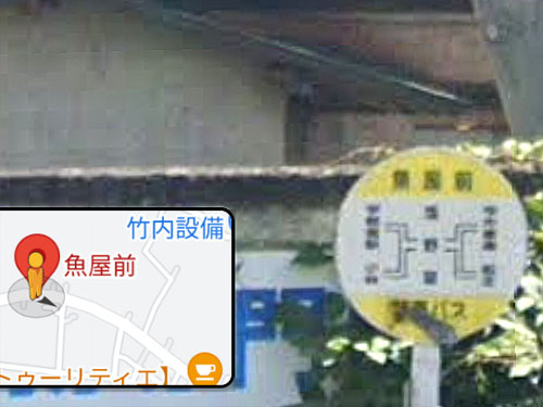 シンプルなバス停名です。ストリートビューで周辺を見回してみても、魚やさんはありませんでした…。 GoogleStreetView |
