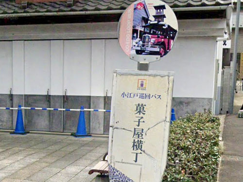 ほっこりするバス停名ですね。観光都市川越ならではと言えるでしょうか。「江戸時代から続く歴史的街並みが広がる「菓子屋横丁」は明治時代初期に活躍した菓子職人、鈴木藤左衛門が川越で和菓子屋さんを開いたことが誕生のきっかけと言われています」(じゃらん)。意外と歴史があるんですね。明治の最盛期には約70軒、現在は約30軒とのこと。 GoogleStreetView |
