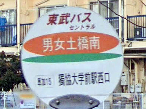 教えてもらえば読めなくはないですが、難読だと思います。男女土橋という橋のほか、そこを通る男女土橋通りもあるそうです。調べましたが由来は分かりませんでした…。東武バスの他「パリポリくんバス」というコミュニティバスも通るそうです。パリポリくんは草加せんべいのマスコットとのこと。 GoogleStreetView |