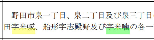 | 千葉県 | 米喊(こめかみ) | 野田市 | ![]() GoogleStreetView ![]() 船形(泉)地区地区計画(野田市)、黄色が米「口+成」、緑が米噛 |