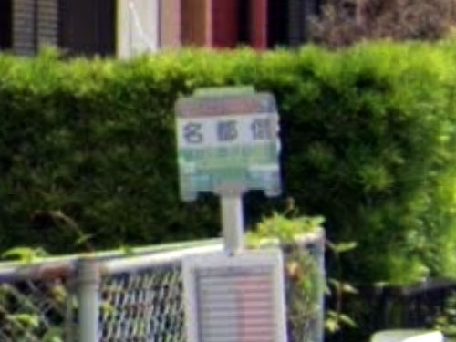 知らないと読めない感じの難読バス停です。「天武天皇の皇子の末裔が関東に下り、現在地に借りの都を置くとした事から名都借(なづかり)と言われています、由緒ある地名です」(名都借わかば自治会)。「なづかり」という難しい読み方の由来については書いてありませんでした…。 GoogleStreetView |