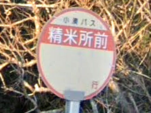 なかなかの山の中にあるバス停です。見える範囲に精米所の看板がないのですが、地元の方には精米所がどこにあるのか分かっているのかも知れません。 GoogleStreetView |
