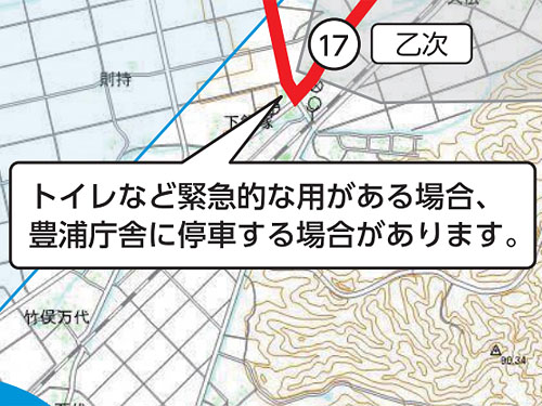 「椡」という珍しい字が使われています。新潟県で使われる地域漢字とのこと。読みは「くぬぎ」だけです。三ツ椡(みつくぬぎ)が公的住所になっています。クヌギの木が多く生えていたことが地名の由来だそうです。 利用ガイドには「トイレなど緊急的な用がある場合、豊浦庁舎に停車する場合があります。」と書いてあって、緊急対応について記載があるのは珍しいと思います。 GoogleStreetView |