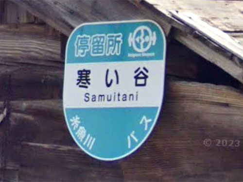 そのものズバリな名前です。周辺の風景もちょっと寒そうです。バス停の丸板がくっついている小屋では昔、馬を飼っていたそうです。近くに遅くまで溶けない雪の谷があり、その雪を利用していたようで、雪がいつまでもあるからさむいたにとなったそうです。 GoogleStreetView |