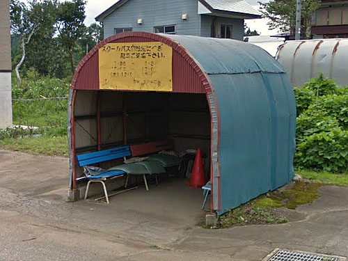 バス停ポールは見当たりませんでした。位置はNavitimeに拠ります。2014年のストリートビューにはこのかまぼこ型の待合室が載っていますが、次の2023年版では雪国によくあるしっかりした待合小屋に変わっていました。でも、バス停名は昔の通り「かまぼこ車庫」になっています。津南小学校、中学校を通るスクールバスが出ています。 GoogleStreetView(2014) |