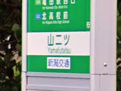 「2つ」がつくところが少しめずらしいですね。「山二ツは「山二津」と記し,大きな砂山と諏訪社の小高い砂丘を控えて,船の風よけの船着き場(津)があったことによるともいう」(新潟市合併町村の歴史4、角川日本地名大辞典)。 GoogleStreetView |
