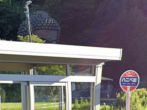 「ハニベ」とは、なかなか聞かない不思議な言葉です。バス停の後ろにあるのは「ハニベ巌窟院」という、彫塑家によって開洞された正式な寺院とのこと。「ハニベ」とは、埴輪など土で彫刻を作る「土師部(はにべし)」のことだそうです。屋根のない場所にある大きな仏頭が名物で、この写真の左奥に上の方だけ写っています。ミステリースポット的な場所だそうです。 GoogleStreetView |
