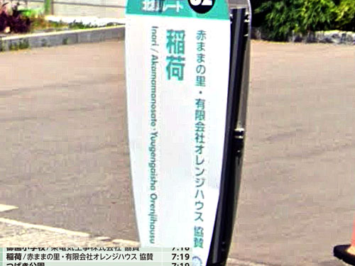 のっティバスにはネーミングライツ(命名権売買)の他に「協賛」という制度もあるようで、バス停標に企業名が大きく書かれています。他にも協賛のついたバス停がいくつかあります。 GoogleStreetView |