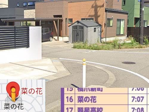 バス停ポールが見当たらず残念です。なんと「菜の花」が公的住所になっています。「菜の花○○」「○○菜の花」というバス停はたくさんありますが、単に「菜の花」というのはここだけのようです。 GoogleStreetView |